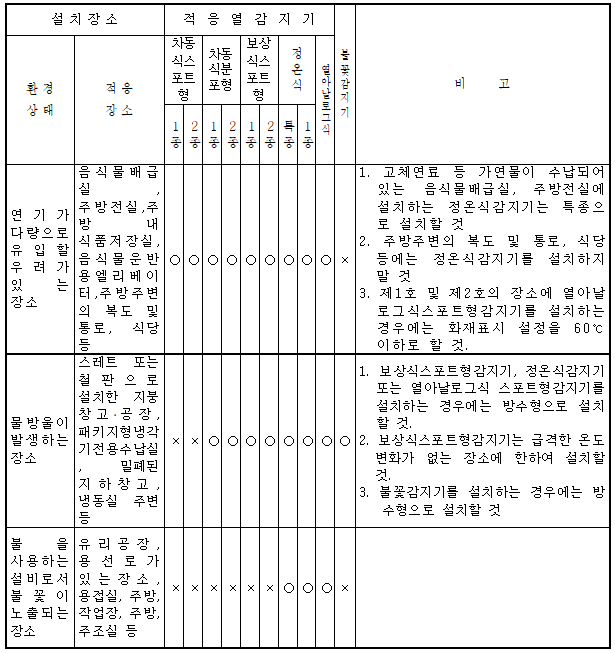 4. 다신호식감지기는 그 감지기가 가지고 있는 종별, 공칭작동온도별로 따르지 말고 상기 표에 따른 적응성이 있는 감지기로 할 것