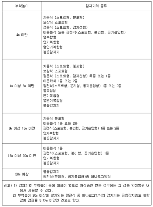 제7조(감지기) ① 자동화재탐지설비의 감지기는 부착높이에 따라 다음 표에 따른 감지기를 설치하여야 한다. 다만, 지하층·무창층 등으로서 환기가 잘되지 아니하거나 실내면적이 40㎡ 미만인 장소, 감지기의 부착면과 실내바닥과의 거리가 2.3m 이하인 곳으로서 일시적으로 발생한 열·연기 또는 먼지 등으로 인하여 화재신호를 발신할 우려가 있는 장소(제5조제2항 본문에 따른 수신기를 설치한 장소를 제외한다)에는 다음 각 호에서 정한 감지기중 적응성 있는 감지기를 설치하여야 한다.